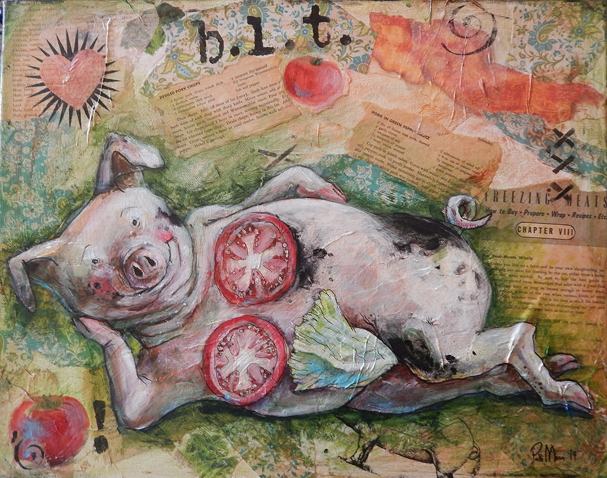 “b.l.t.” is a 20×16″ mixed media painting on stretched canvas. I incorporated yellowed pork recipe pages from a musty old cookbook I scored at the Nashville flea market.